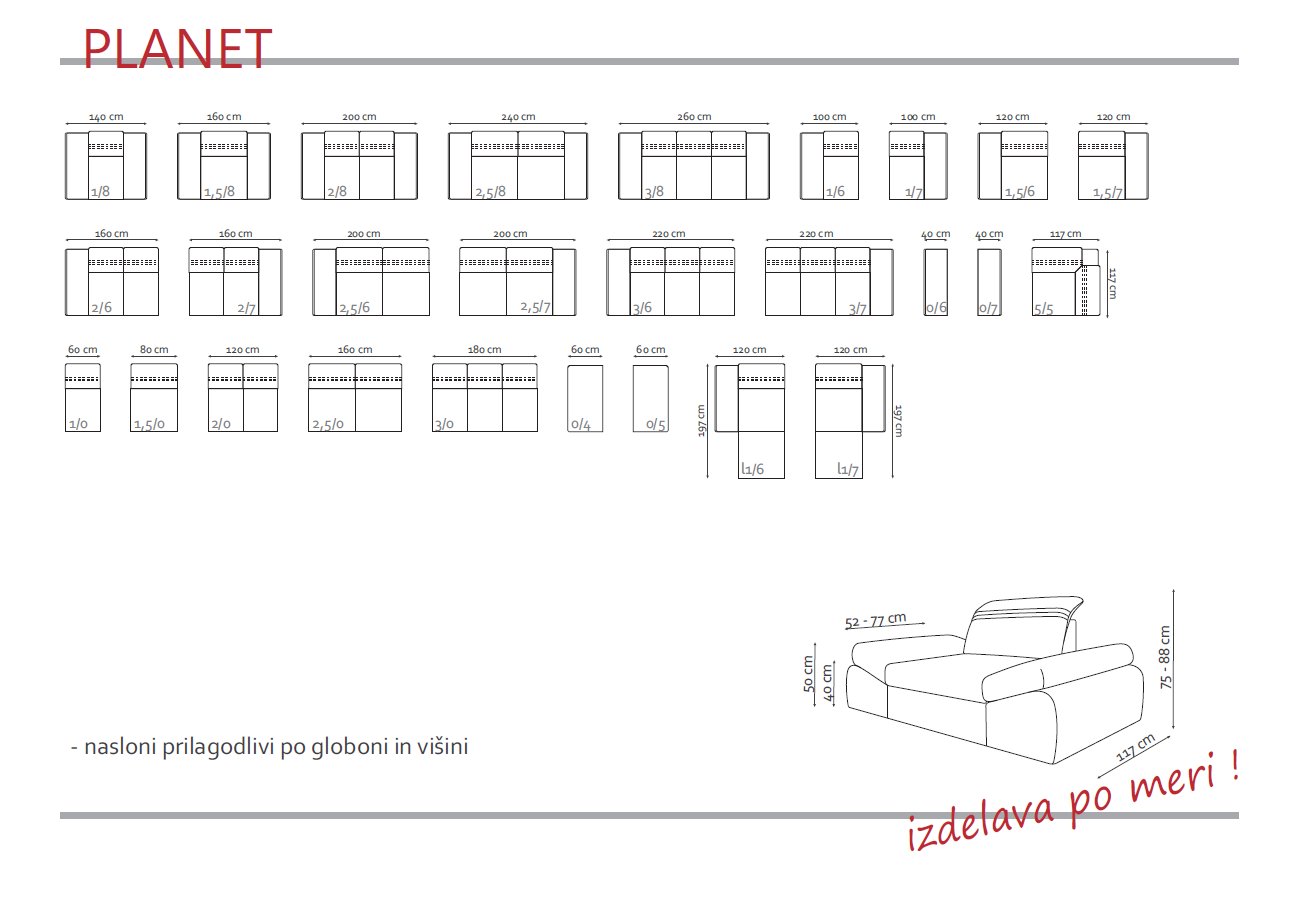 Planet je sedežna garnitura modernih zaobljenih linij pri kateri se naslon lahko premika po globini, tako da imamo lahko globino sedeža 55 cm ali 80 cm, naslon pa je prilagodljiv tudi po višini.
