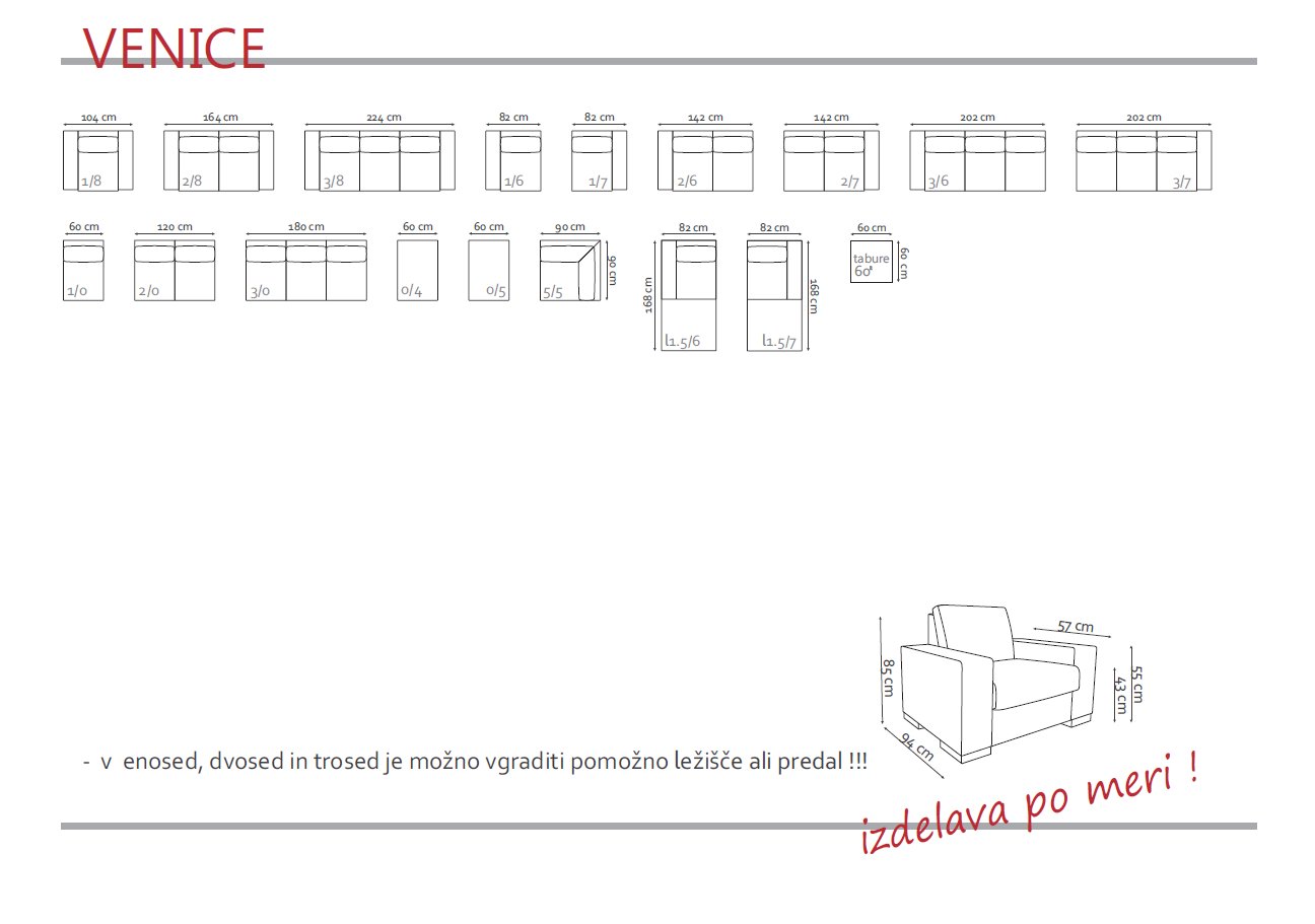 Venice je sedežna garnitura s srednje visokim gladkim, oglatim naslonom. V sedežno garnituro je možno vgraditi pomožno ležišče kateri služi kot začasno ležišče, vzljubili pa ga boste predvsem za večerna poležavanja pred televizijo.